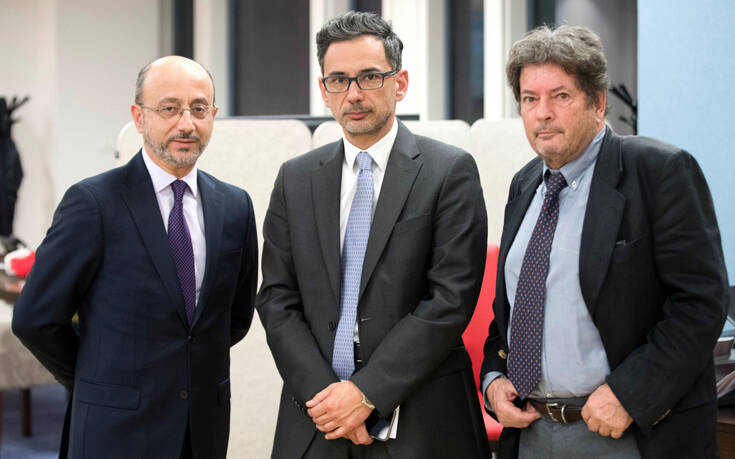 Ο συγγραφέας Κωνσταντίνος Σπ. Στάικος με τους Γιάννη Καντώρο, διευθύνοντα σύμβουλο και Γιάννη Ρούντο, διευθυντή εταιρικών υποθέσεων και υπευθυνότητας της INTERAMERICAN