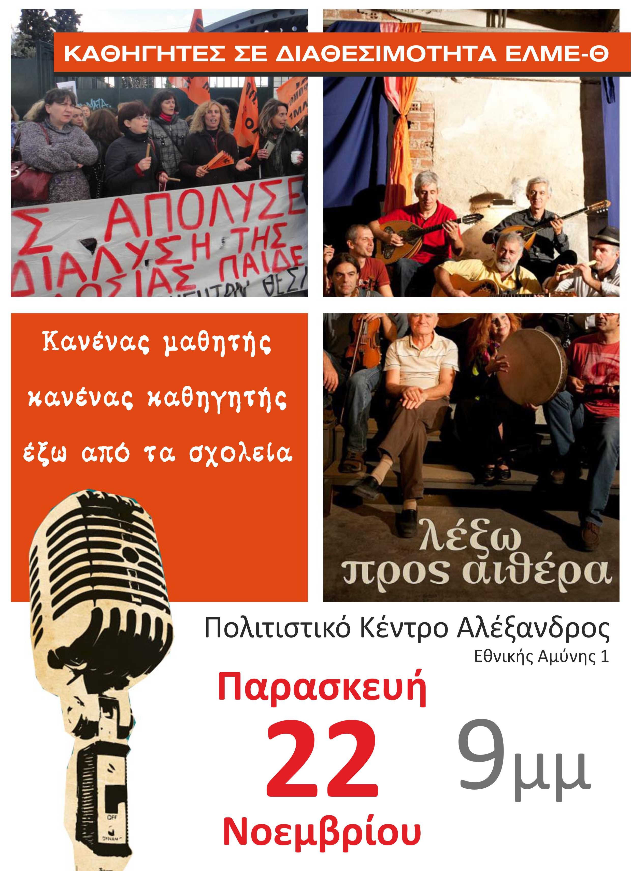 Μουσική εκδήλωση αφιερωμένη στην παιδεία με το μουσικό σχήμα «Λέξω προς αιθέρα» διοργανώνουν οι καθηγητές σε διαθεσιμότητα της Θεσσαλονίκης και οι ΕΛΜΕ Θεσσαλονίκης, την Παρασκευή 22 Νοεμβρίου 2013, στις 9 μμ στο Πολιτιστικό Κέντρο Αλέξανδρος (Εθνικής Αμύνης 1, Θεσσαλονίκη).
