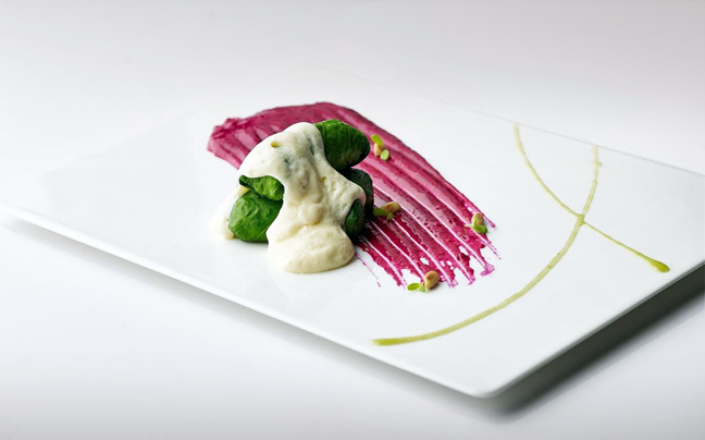 – Φρέσκα λαχανικά, φοινόκιο, βαλεριάνα, αχλάδια poached σε κρασί & κοπανιστή Μυκόνου