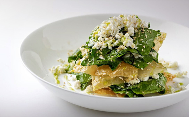– Σαλάτα σπανακόπιτα, φύλλο ψημένο με στακοβούτυρο & βινεγκρέτ μέλι