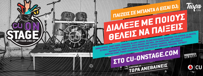 Το CU σε συνεργασία με το Τώρα Κ44 και το Reworks Festival διοργανώνουν το CU ONSTAGE, τον πρώτο μουσικό διαγωνισμό στον οποίο νέοι μουσικοί, μπάντες, solo artists, DJs και DJ crews έχουν τη δυνατότητα να διαλέξουν το line up της συναυλίας τους και να παίξουν δίπλα στους αγαπημένους τους καλλιτέχνες.
