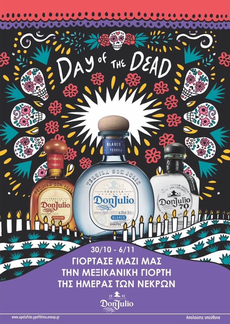 Εσείς δεν έχετε παρά να επιλέξετε το δικό σας αγαπημένο, από τα 51 μπαρ σε όλη την Ελλάδα, να απολαύσετε με την παρέα σας ένα μοναδικό Don Julio κοκτέιλ «προς τιμήν όσων έφυγαν από κοντά μας» και να ζήσετε την αυθεντική μεξικάνικη γιορτή της Ημέρας των Νεκρών.