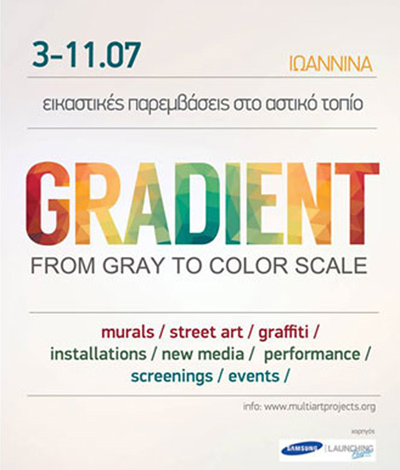 Από τις 3 έως και τις 11 Ιουλίου, το project “Gradient: From Gray to Color Scale” που υλοποιείται με την υποστήριξη του Samsung Launching People, θα συγκεντρώσει περισσότερους από 30 εικαστικούς και street art καλλιτέχνες, από όλη την Ελλάδα και το εξωτερικό, στα Ιωάννινα, δημιουργώντας μία μεγάλης κλίμακας εικαστική παρέμβαση στην πόλη των Ιωαννίνων.