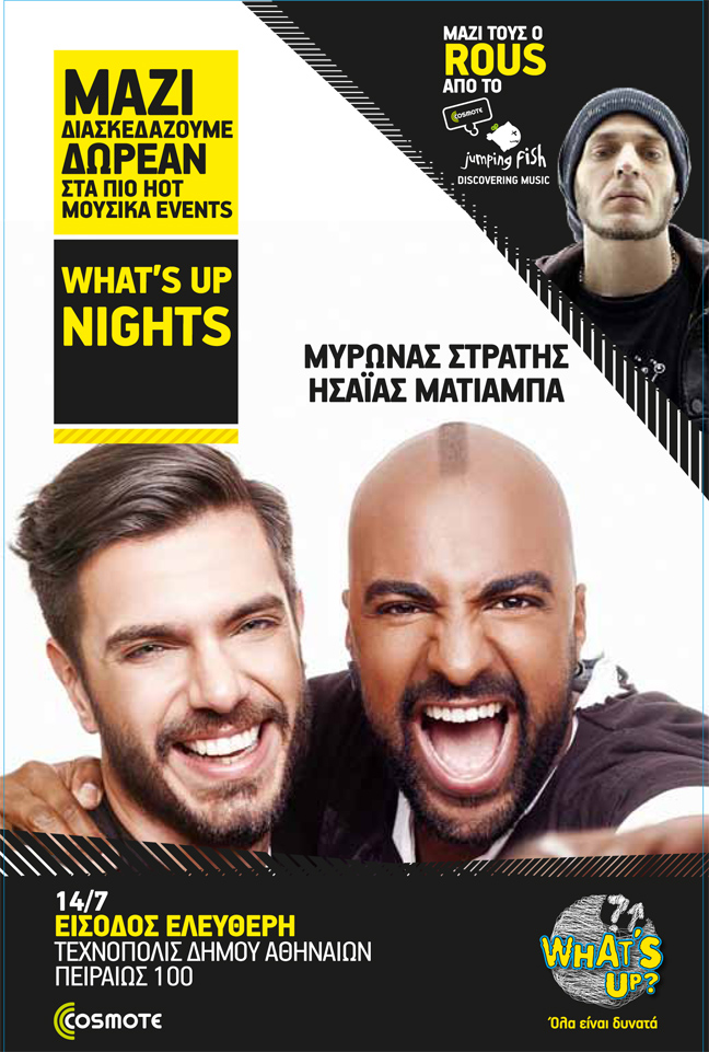 Το WHΑT’S UP της COSMOTE εγκαινιάζει ένα νέο μουσικό θεσμό, δίνοντας τη δυνατότητα στο κοινό να παρακολουθήσει εντελώς δωρεάν, μοναδικές μουσικές βραδιές. Αυτή θα είναι η πρώτη από μια σειρά συναυλιών, που θα πραγματοποιηθούν μέσα στο χρόνο. Ο Μύρωνας Στρατής και ο Ησαΐας Ματιάμπα με dance διαθέσεις και ξεχωριστές διασκευές είναι έτοιμοι για ένα κεφάτο πρόγραμμα για όλες τις ηλικίες. Τη συναυλία θα ανοίξει ο Rous, που αναδείχθηκε από το Jumping Fish της COSMOTE, παρουσιάζοντας μια διαφορετική live πρόταση.