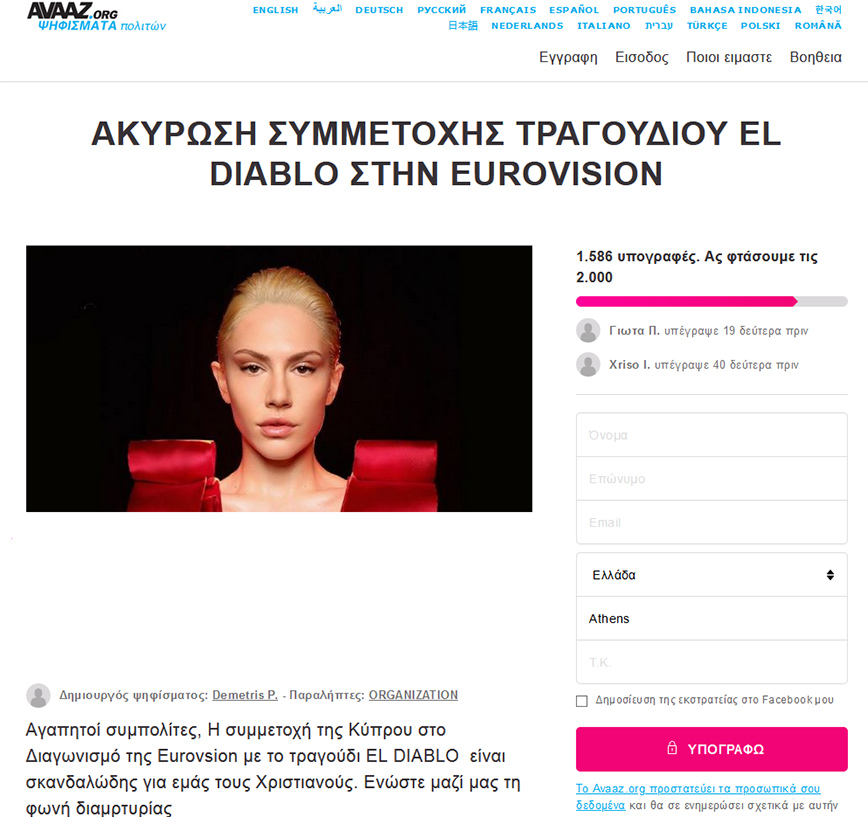 Να ακυρωθεί η συμμετοχή της Κύπρου στη Eurovision με το τραγούδι «El Diablo», το οποίο ερμηνεύει η Έλενα Τσαγκρινού, ζητούν Χριστιανοί, με ψήφισμά τους στην πλατφόρμα Avaaz.
