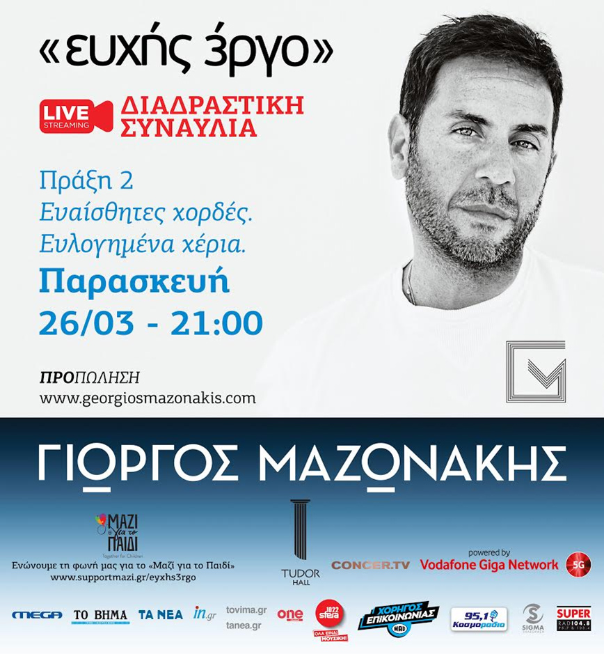 Ο ένας και μοναδικός Γιώργος Μαζωνάκης μας προσκαλεί να ενώσουμε τη φωνή μας με το μέσα μας σε 3 live streaming συναυλίες με γενικό τίτλο «ΕΥΧΗΣ 3ΡΓΟ», στηρίζοντας έμπρακτα και το σπουδαίο έργο της Ένωσης «Μαζί για το Παιδί», συμβάλλοντας ουσιαστικά στην προσφορά ίσων ευκαιριών στα παιδιά των Ακριτικών περιοχών της Ελλάδας!