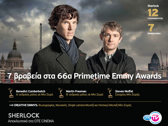 Επτά βραβεία κατέκτησε η σειρά Sherlock -μέσα από 12 υποψηφιότητες- στα 66α Primetime Emmy Awards, τα οποία απονεμήθηκαν εχθές στο Nokia Theatre του Λος Άντζελες. Στην πολυβραβευμένη σειρά, που προβάλλει αποκλειστικά στην ελληνική τηλεόραση ο ΟΤΕ TV, πρωταγωνιστούν ο Μπένεντικτ Κάμπερμπατς ως Σέρλοκ Χόλμς και ο Μάρτιν Φρίμαν ως Δρ. Τζον Γουάτσον.