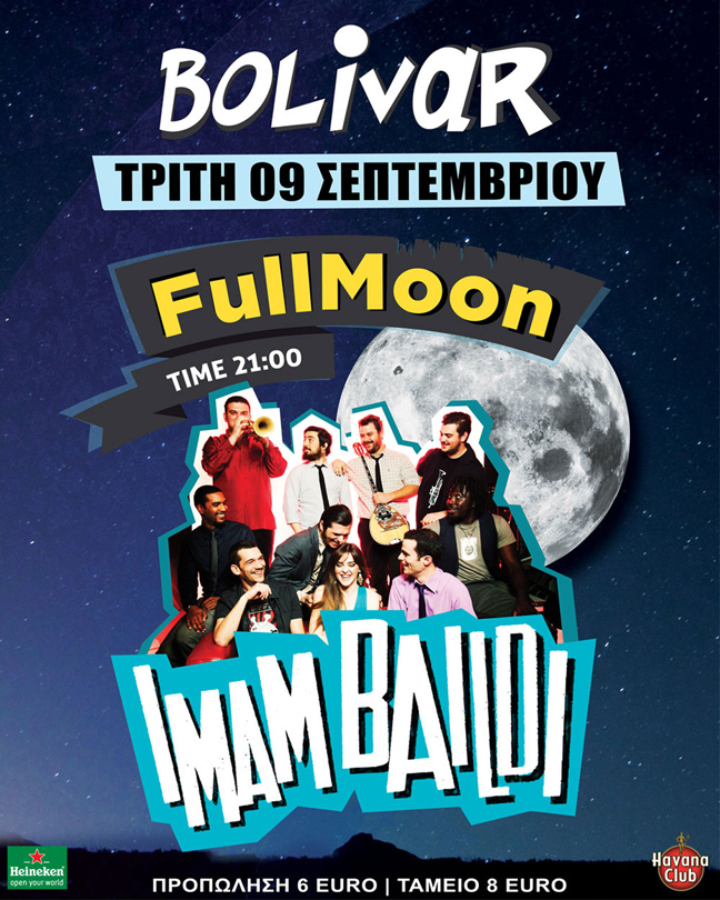Τρίτη 9 Σεπτεμβρίου και στο Full Moon Party του Bolivar μία ακόμη μουσική γιορτή θα στηθεί, με τους Imam Baildi να εγκαινιάζουν τη νέα φθινοπωρινή τους περιοδεία με τον ολόφρεσκο δίσκο «IMAM BAILDI – III».