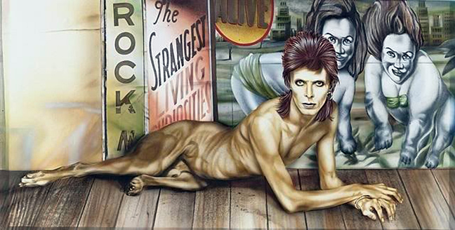 Το συγκεκριμένο εξώφυλλο με τον εκκεντρικό σταρ να ποζάρει μισός άνθρωπος – μισός σκύλος του Guy Peellaert, δέχτηκε πολλές «διορθώσεις».