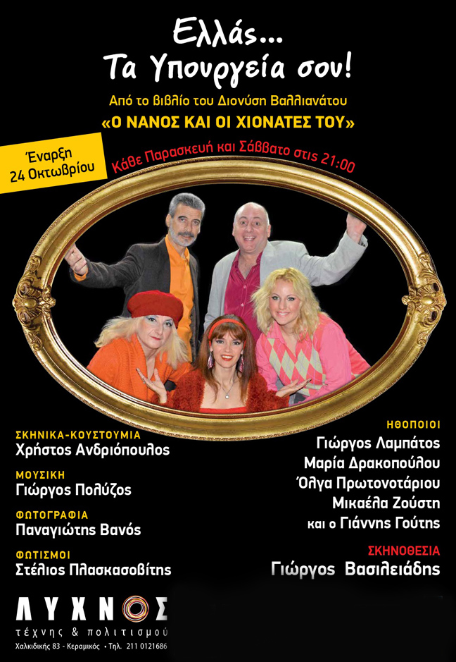 Το θέατρο «ΛΥΧΝΟΣ τέχνης & πολιτισμού » θα φιλοξενήσει από 24 Οκτώβρη 2014, το έργο «ΕΛΛΑΣ… ΤΑ ΥΠΟΥΡΓΕΙΑ ΣΟΥ!»