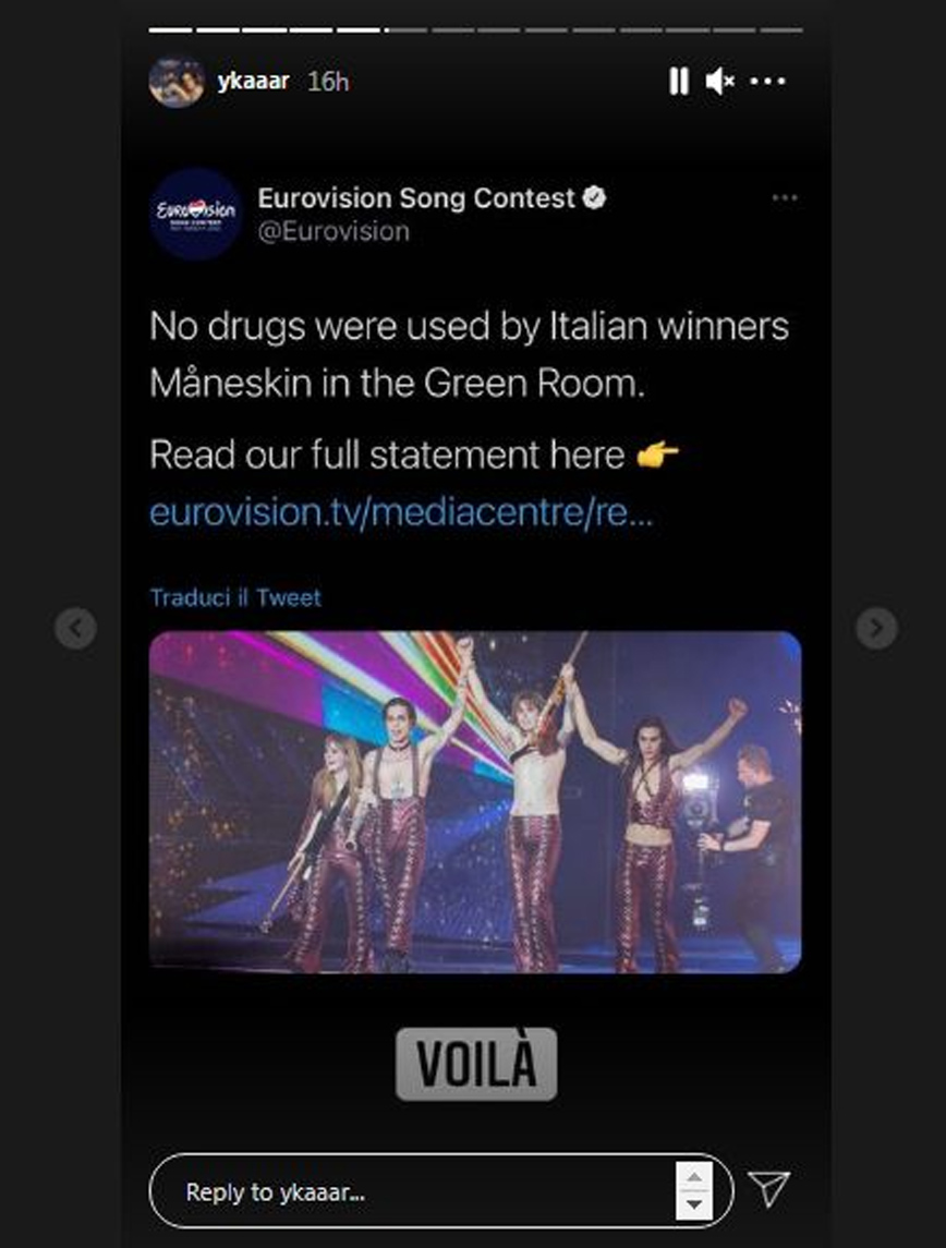 Ο frontman των Maneskin δημοσίευσε το tweet της EBU γράφοντας «Voila» και με αυτόν τον τρόπο άφησε αιχμές για τη γαλλική συμμετοχή.