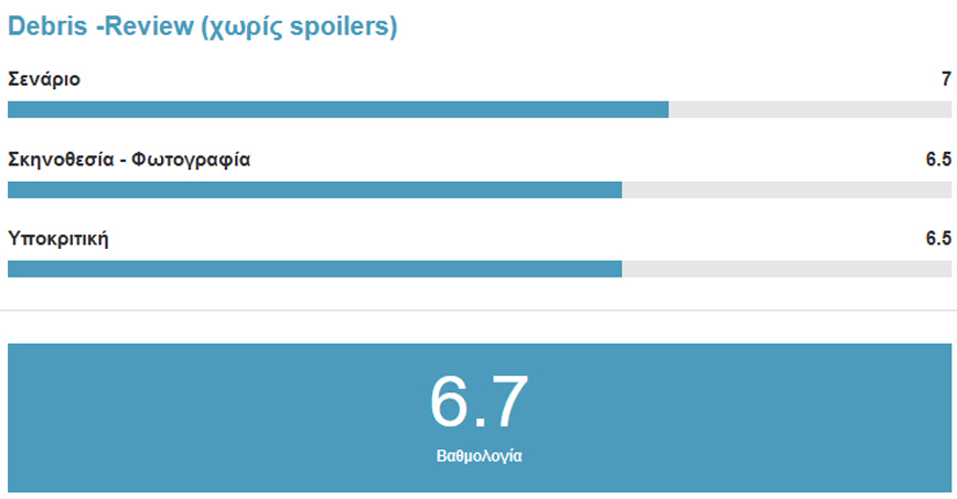 Η ιδέα πίσω από το Debris είναι και καλή και ιντριγκαδόρικη. Αλλά μένει αναξιοποίητη. Ουδέποτε αντιλαμβανόμαστε πλήρως τι ακριβώς θέλει η Influx (η οργάνωση που θέλει τα Συντρίμμια), ενώ παραμένει ασαφές το τι συνέβη με το σκάφος και πως κατέληξε να συντριβεί στον πλανήτη μας.