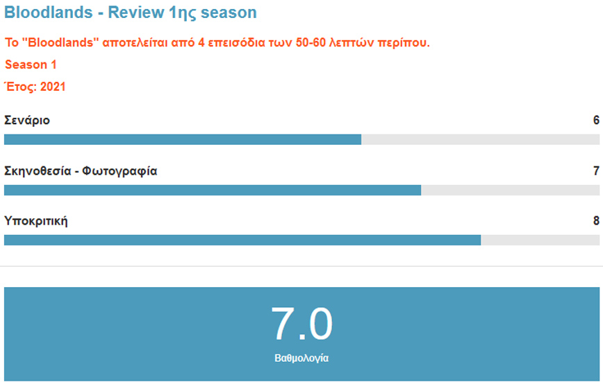 Η σειρά «Bloodlands» είναι μία πολύ αξιόλογη προσπάθεια αλλά κακά τα ψέματα όλη η σειρά είναι ο πρωταγωνιστής Tom Brannick που φυσικά του δίνει ζωή ο εξαιρετικός James Nesbitt. Σεναριακά είναι αρκετά έξυπνη σειρά που ξεφεύγει λίγο από τα κλισέ και το μοτίβο των περισσότερων δολοφόνων και με έξυπνες ανατροπές αλλά και εκπλήξεις καταφέρνει να σε κρατάει. Βέβαια πρόκειται για μία παραγωγή του BBC οπότε είναι αρκετά βαριά σειρά, αλλά με μόλις τέσσερα μονόωρα επεισόδια δεν θα σας νοιάξει και ιδιαίτερα.