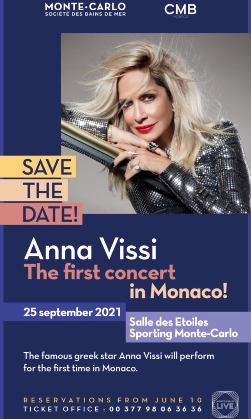 Για πρώτη φορά στη σκηνή του Salle des Etoiles στο Μόντε Κάρλο θα εμφανιστεί η Άννα Βίσση το Σάββατο 25 Σεπτεμβρίου 2021, για ένα βράδυ μόνο.