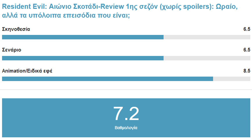 Για να τα λέμε όλα όμως, οπτικά η σειρά είναι ένα πραγματικά υπέροχο δημιούργημα, που είναι και αυτό που στο τέλος της μέρας μένει από το Resident Evil: Αιώνιο Σκοτάδι. Το σενάριο είναι ενδιαφέρον, απλά χάνει σε πολλά σημεία του από την ανεπαρκή ανάπτυξη της ιστορίας μέσα από τα 4 επεισόδια.