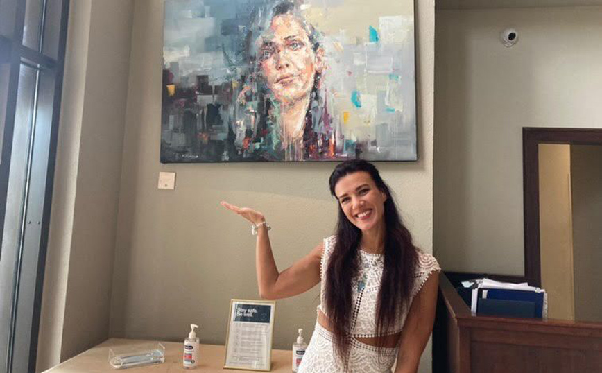 «Μου αρέσει που ζωγραφίζει τις γυναίκες με τρόπο που νιώθουμε σαν να κοιτάζουμε την ψυχή τους και να βλέπουμε την εσωτερική τους ομορφιά» λέει, σχολιάζοντας τους πίνακες του Θεσσαλονικιού ζωγράφου Νίκου Βαβάτση, οι οποίοι εκτίθενται στο λόμπι του Hyatt όπου έγινε η συνέντευξη.