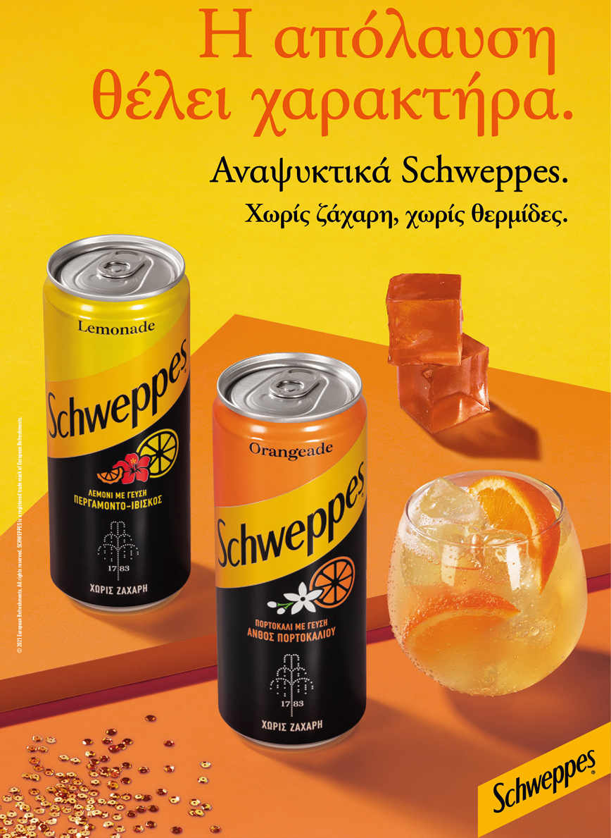 Στο πλαίσιο της καμπάνιας «Η απόλαυση θέλει χαρακτήρα», το brand έχει σχεδιάσει ένα ολοκληρωμένο πλάνο επικοινωνίας, που περιλαμβάνει τηλεοπτικό σποτ, print, digital και outdoor ενέργειες, αλλά και συνεργασίες με αγαπημένους influencers, υπενθυμίζοντας πως όποια κι αν είναι η περίσταση, από το μεσημέρι στο γραφείο μέχρι το απόγευμα στο σπίτι και το βράδυ στο μπαρ, τα αναψυκτικά Schweppes αποτελούν την ιδανική επιλογή για τις καθημερινές στιγμές απόλαυσης.