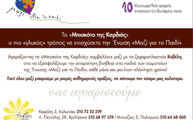 Μια εξαιρετική πρωτοβουλία των ζαχαροπλαστείων Κυβέλη λαμβάνει σάρκα και οστά, κι εμείς δεν έχουμε παρά να την επικροτήσουμε και να πάρουμε μέρος σε αυτή.