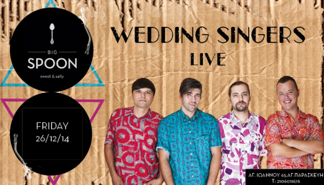 Τη δεύτερη μέρα των Χριστουγέννων, το βράδυ της Παρασκευής στις 26 Δεκεμβρίου, δίνουμε όλοι ραντεβού στο Big Spoon –«αδερφάκι» του επιτυχημένου White Spoon στο Χολαργό– στην πολυσύχναστη πλατεία Αγίου Ιωάννου στην Αγία Παρασκευή, για να απολαύσουμε παρέα, να διασκεδάσουμε και να χορέψουμε με τις μουσικές των Wedding Singers.