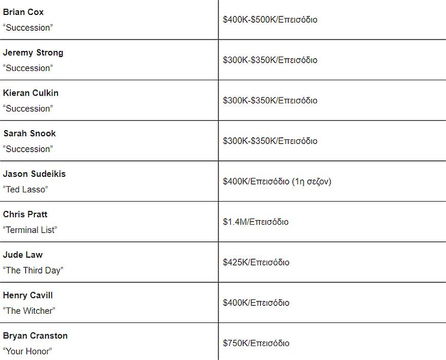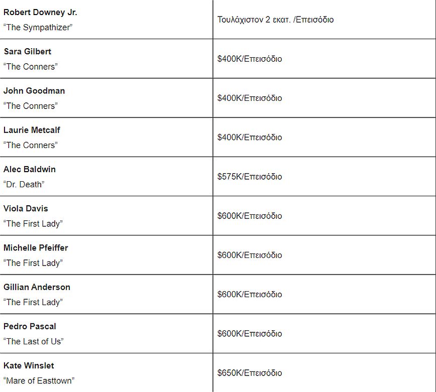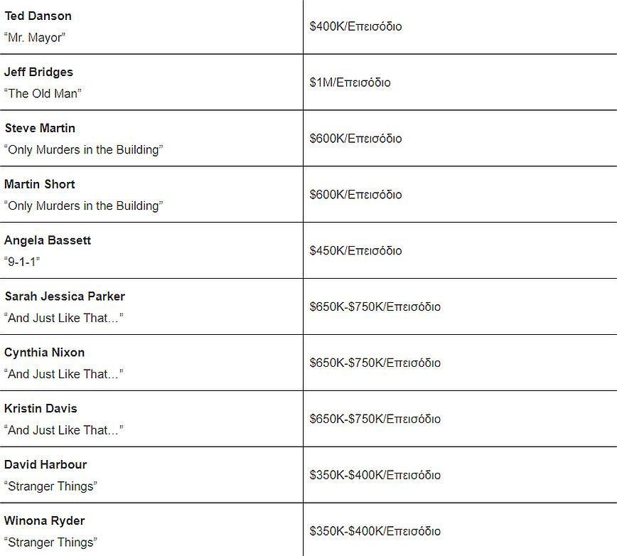 Σίγουρα τα παραπάνω ποσά “ζαλίζουν”, ειδικά αν σκεφτούμε πως αφορούν αμοιβή ανά επεισόδιο και όχι συνολική. Κατά τα άλλα. στις υψηλότερες θέσεις της λίστας βρίσκονται επίσης οι Jeff Bridges με 1 εκατ. δολάρια ανά επεισόδιο για την επερχόμενη σειρά, The Old Man, και ο Bryan Cranston με 750 χιλ. δολάρια ανά επεισόδιο για το Your Honor.