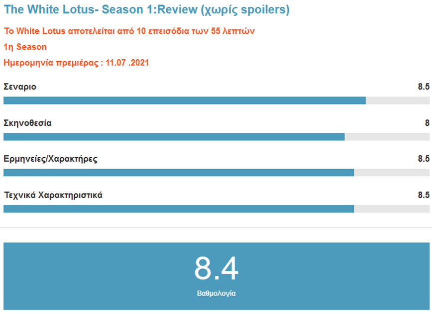 Τελική Ετυμηγορία: Είτε επιζητάτε λίγες διακοπές ακόμα, είτε μια ιδιαίτερη ποιοτική σειρά στη κατηγορία της, τότε το The White Lotus αξίζει της προσοχής σας. Εξάλλου, oι fans των μίνι σειρών, γνωρίζουν ότι το ΗΒΟ είναι από τα πιο αξιόλογα δίκτυα στη δημιουργία αξιόλογων παραγωγών του είδους και το The White Lotus σίγουρα είναι μία από τις δυνατές φετινές προτάσεις του δικτύου.