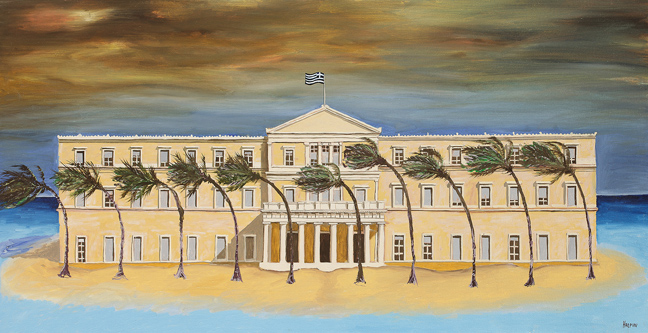 Τα Ελληνικά του θεματικά έργα απεικονίζουν άλλοτε την Ελλάδα της κρίσης με εύστοχα στοιχεία που παραπέμπουν στους κλυδωνισμούς της εποχής και στο διεθνή πολιτικό ιστό που υφαίνεται πέριξ της Ελλάδας και άλλοτε ευτράπελες πλευρές της Ελληνικής ανθρώπινης φύσης, κουλτούρας και καθημερινότητας. Τρία από τα μεγάλα του έργα είναι κομμάτι της σειράς “αντίστροφα”, όπου αποτυπώνεται η σκληρή αλήθεια της πραγματικότητας, αυτή της παρακμής και εγκατάλειψης αξιοθαύμαστων αρχιτεκτονικά κτιρίων στο Ηράκλειο, και παράλληλα σε αντίστροφο προβολικά επίπεδο, το πως θα μπορούσαν τα ίδια κτίρια να δείχνουν αναδεικνύοντας την ξεχασμένη ομορφιά και αλλοτινή αίγλη τους. Το δυαδικό ζεύγος πραγματικό-υπερβατικό, ζωή-όραμα, παρόν-μέλλον, παρακμή-δόξα κτλ. σαν άλλος χρησμός, δίνει το στίγμα των καιρών, αρκεί απλά ο θεατής να μπει μέσα στον πίνακα και όχι να τον δει από τη μία πλευρά του μόνο. Άλλη ενότητα αποτελούν τα λεγόμενα “story” έργα του, πίνακες με ένα απλό μήνυμα κάθε φορά διατυπωμένο με κωμικό τρόπο, χιουμοριστικές νότες και τίτλο εξίσου χαριτωμένο και παιχνιδιάρικο, αλλά που απηχούν πιο σοβαρά λανθάνοντα θέματα που εύστοχα προβάλλονται στο χώρο του υπερβατικού για να προβληματίσουν τον θεατή.