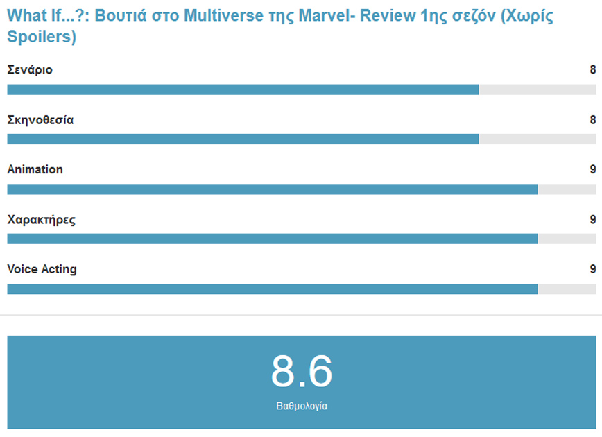 Η 1η σεζόν του What If κάνει εξαιρετική δουλειά και μας χαρίζει ιστορίες που μας κάνουν να ευχόμαστε να τις είχαμε δει σε κάποια κινηματογραφική αίθουσα. Από την άλλη το γεγονός ότι η Marvel επιτέλους χρησιμοποιεί το Animation ως μέσο αφήγησης για μια ιστορία της είναι αρκετά αισιόδοξο για τους Fans του είδους καθώς καταφέρνει να αποδείξει πως δεν χρειάζεται μια σειρά να είναι Live action για να την πάρουμε στα σοβαρά. Κύριο λόγο σε αυτό βέβαια παίζει και η εξαιρετική δουλειά του στούντιο στο animation της σειράς που κατάφερε να ζωντανέψει χαρακτήρες και σκηνικά μαχών με φανταστικό τρόπο.