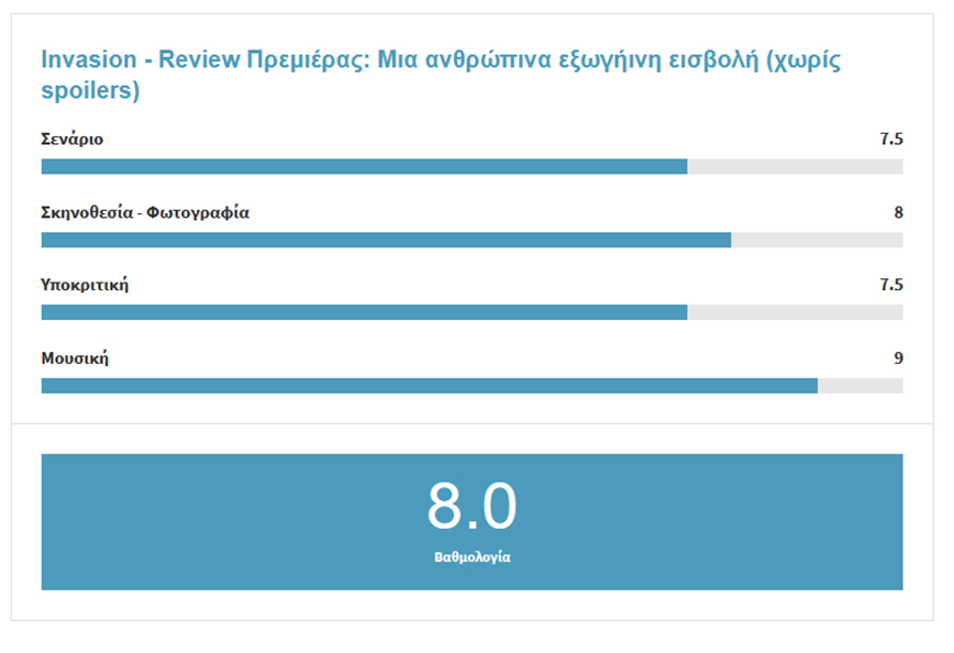 Οι φανς των τεράτων – εξωγήινων ίσως απογοητευθούν αλλά το Invasion έχει τέτοια ένταση όπου θα τους καλύψει, καθώς δημιουργεί με την τριών επεισοδίων πρεμιέρα το απόλυτο binge watching αλλά και το χειρότερο cliffhanger όταν τελειώνει καθώς πρέπει να περιμένεις κάθε εβδομάδα το επόμενο επεισόδιο.