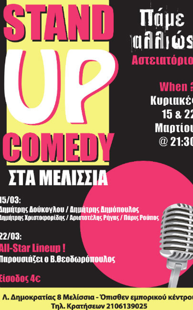 Την Κυριακή 15 Μαρτίου οι Δημήτρης Δούκογλου, Δημήτρης Δημόπουλος, Δημήτρης Χριστοφορίδης, Αριστοτέλης Ρήγας και Πάρις Ρούπος δίνουν τον καλύτερό τους εαυτό για μια βραδιά που θα σας μείνει αξέχαστη, ενώ την Κυριακή 22 Μαρτίου στο “stage” ανεβαίνει ο Β. Θεοδωρόπουλος, ο οποίος με τους κωμικούς αυτοσχεδιασμούς του αναλαμβάνει να σας προσφέρει αμέτρητες στιγμές γέλιου.