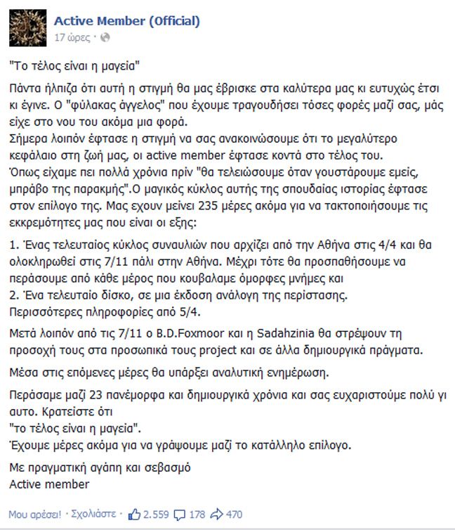 Δείτε το μήνυμα τους στο facebook με τον τίτλο «Το τέλος είναι η μαγεία»: «Πάντα ήλπιζα ότι αυτή η στιγμή θα μας έβρισκε στα καλύτερα μας κι ευτυχώς έτσι κι έγινε. Ο ‘φύλακας άγγελος’ που έχουμε τραγουδήσει τόσες φορές μαζί σας, μάς είχε στο νου του ακόμα μια φορά. Σήμερα λοιπόν έφτασε η στιγμή να σας ανακοινώσουμε ότι το μεγαλύτερο κεφάλαιο στη ζωή μας, οι active member έφτασε κοντά στο τέλος του. Όπως είχαμε πει πολλά χρόνια πρίν ‘θα τελειώσουμε όταν γουστάρουμε εμείς, μπράβο της παρακμής’.