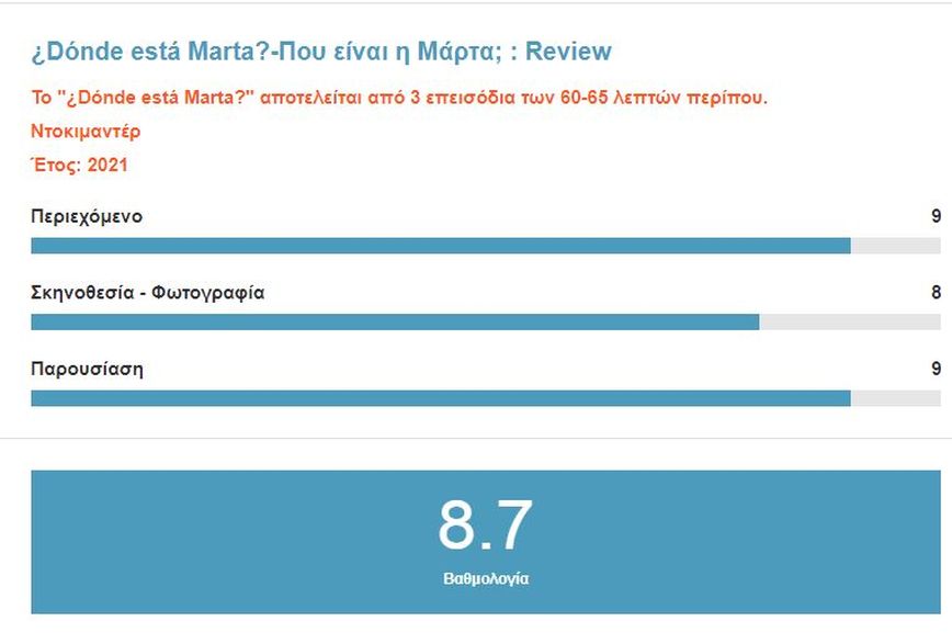 Κλείνοντας έχω να πω πως το «¿Dónde está Marta?-Where is Marta-Που είναι η Μάρτα» άνετα το βάζω στα top true crime ντοκιμαντέρ που έχω δει και για άλλη μία φορά μου δίνει να καταλάβω πως όσο υπάρχουν στόματα κλειστά στην ανθρωπότητα θα υπάρχουν πάντα τέτοιες ανάλογες υποθέσεις.