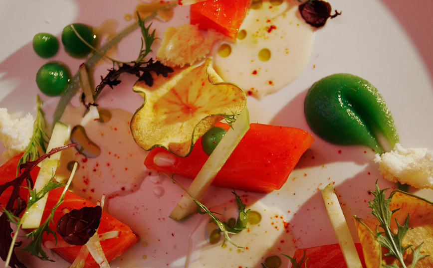 Ο σεφ επιλέγει να κινηθεί με μία πιο απλή κάρτα στο μεσημεριανό, ενώ διευρύνει τις επιλογές στο βραδινό. Αναλυτικότερα, η πιο comfort μεσημεριανή επιλογή, περιλαμβάνει carpaccio τόνου με bloody mary gel, πιπέρι σετσουάν, πίκλα σταφύλι, φινόκιο και ponzu, μαγιάτικο tartare με macadamia, confit τοματίνια, ραπανάκι, αγγούρι, παπαρουνόσπορο και passion fruit vinaigrette, μοσχάρι carpaccio με πίκλα shimeji, yuzu, λάδι τρούφας, chips λαγόχορτου. Στην κατηγορία των ορεκτικών βρίσκουμε επίσης το χαρακτηρiστικό vitello tonnato, από κόντρα μόσχου γάλακτος, σάλτσα τόνου, καπνιστό χέλι, τραγανή κάπαρη και ραπανάκι. Bao buns αλλά και μία μεγάλη επιλογή από Flatbreads, όπως το flatbread oxtail με σιγομαγειρεμένη μοσχαρίσια ουρά, το Black με sashimi τόνου, αλλά και το Sobrassada με παρμεζάνα, asiago, αυγό ποσέ και mizuna δίνουν το δικό τους τόνο στα ορεκτικά.