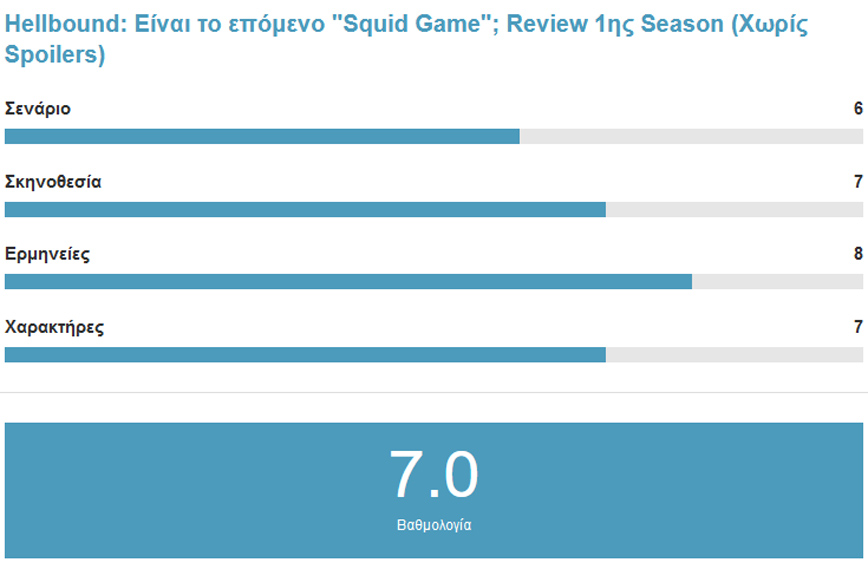 Από πολλούς η σειρά χαρακτηρίστηκε ως το επόμενο «Squid Game». Η αλήθεια είναι ότι βρίσκω τον συσχετισμό άτυπο. Οι δύο σειρές δεν έχουν τίποτα κοινό πέρα από μερικούς αποτρόπαιους θανάτους. Το Hellbound μπορεί να κυριαρχεί το Top 10 αλλά δύσκολα θα ξεπεράσει τον βασιλιά του Netflix.Η σειρά όμως έχει την δική της ταυτότητα και αυτό είναι πολύ καλό. Όπως και το Squid Game έτσι και το Hellbound θέτουν κάποια πολύ σημαντικά ερωτήματα σχετικά με την ζωή και την ανθρώπινη αξία. Ποιός ο ρόλος του Θεού σε όλο αυτό; Άγνωστο αλλά θα ήταν ωραίο να δούμε τι απάντηση έχει να δώσει η σειρά σε μια πιθανή 2η σεζόν. Ειδικά το τέλος της σεζόν γεννά πολλά νέα ερωτήματα αλλά και μονοπάτια για κάτι εντελώς απρόσμενο.