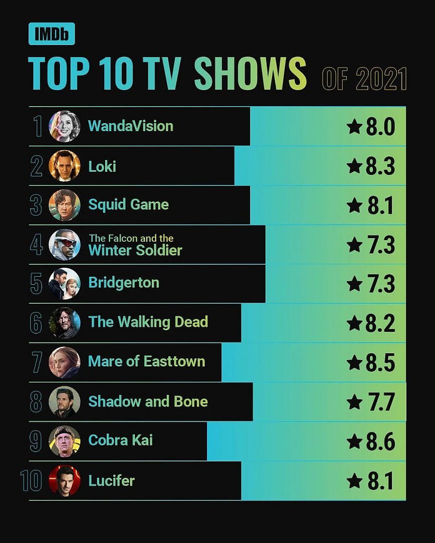 Όπως μας ενημερώνει το Lordoftheseries.gr το IMDb έστεψε την χρυσή δεκάδα του με την Marvel και το Disney+ να κυριαρχούν ενώ το Netflix έχει ακόμη ισχυρή παρουσία.