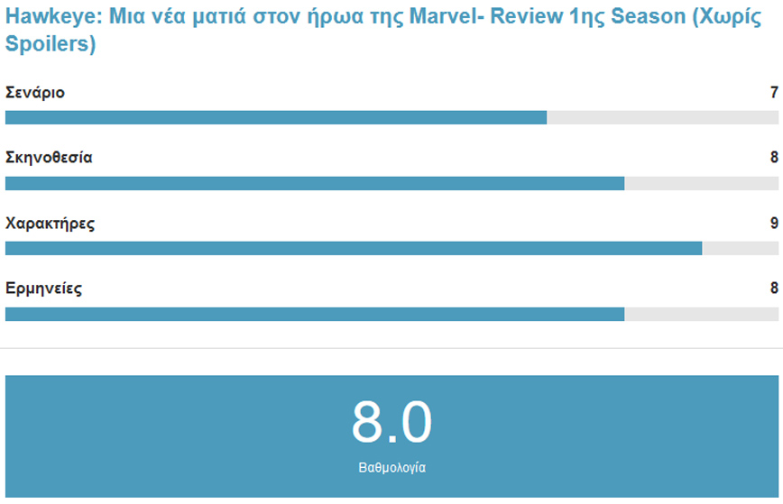 Η σειρά καταφέρνει να κάνει κάτι πραγματικά ιδιαίτερο. Αρχικά ξεκινώντας την σειρά μπορεί να φανταστείς πως αυτό είναι το κύκνειο άσμα του Hawkeye και πως στην ουσία θα δούμε μια ιστορία για το πώς θα παραδόσει τον μανδύα του ήρωα στην Kate Bishop. Η Marvel όμως καταφέρνει να επανενταξει τον ήρωα στο MCU παρουσιάζοντας τον με έναν πολύ όμορφο τρόπο και επιτέλους μπορούμε να πούμε πως τον δικαίωσε. Γενικά η 4η φάση του MCU δουλεύει πολύ καλά σε αυτό καθώς δίνει τον χρόνο σε χαρακτήρες που ξέραμε, αλλά δεν ξέραμε, να τους μάθουμε καλύτερα. Κατά κάποιον τρόπο αυτοί οι ήρωες μετά από χρόνια συμμετοχής στο MCU δικαιώνονται και αποκτούν δικό τους υπόβαθρο. Και πέρα από τους ίδιους τους ήρωες δικαιώνονται και οι Fans τους.