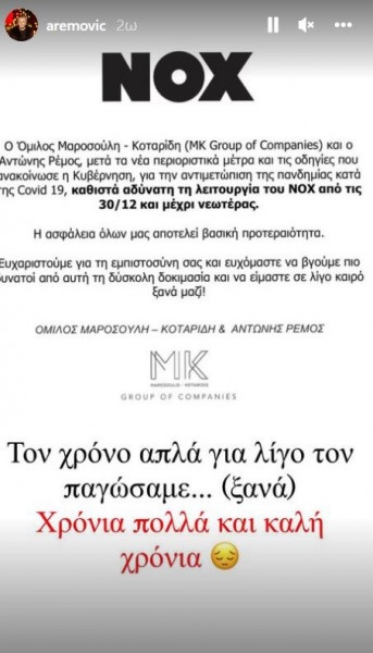 Ο Αντώνης Ρέμος κατέθεσε τη δική του άποψη για το κλείσιμο του νυχτερινού κέντρου όπου εμφανίζεται. Οι ιδιοκτήτες του «NOX» αποφάσισαν να αναστείλουν την λειτουργία του έπειτα από την ανακοίνωση των νέων μέτρων κατά της μετάδοσης του κορονοϊού.