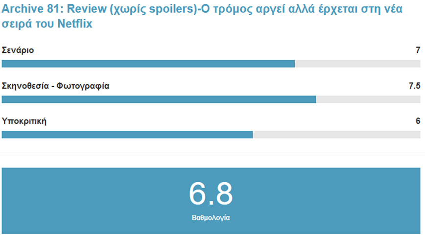 Το Archive 81 είναι μία αρκετά ενδιαφέρουσα σειρά τρόμου από το Netflix, η οποία έχει τον δικό της ρυθμό, όχι αργό ούτε όμως και γρήγορο. Κάπου στο μέσον. Η ιστορία κρατάει σε αγωνία τον θεατή ενώ υπάρχουν και οι αδιάφορες στιγμές.