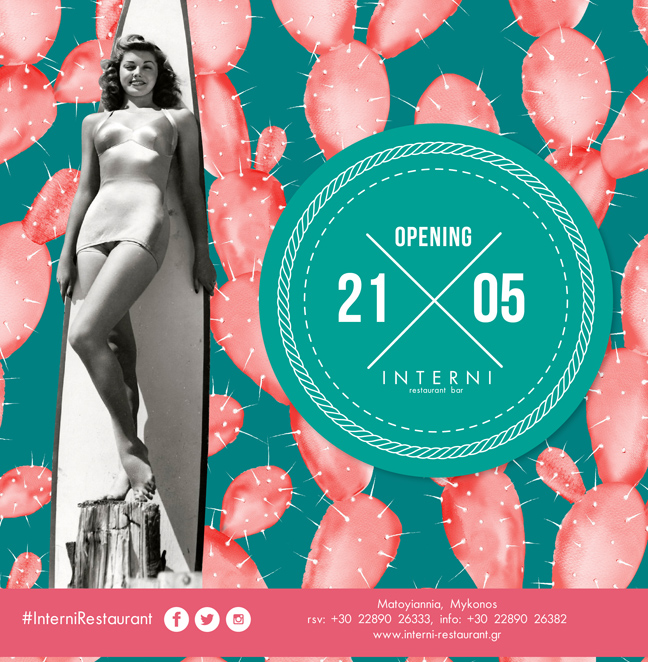Τηλέφωνο για κρατήσεις: 22890 26 333 και στο email [email protected]. Για περισσότερες πληροφορίες επισκεφτείτε το www.interni-restaurant.gr και www.facebook.com/pages/Interni-Resturant-Mykonos.