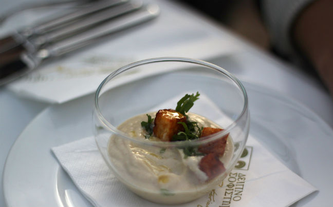 Το μενού είναι πλήρες και αποτελείται από πέντε πιάτα, συνοδευμένο από κρασί και ένα επιδόρπιο έκπληξη, με όλα τους να εκπροσωπούν τη μεσογειακή κουζίνα που εμφανίζει ιδιαίτερη αδυναμία στα ελληνικά προϊόντα.