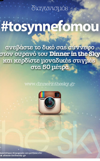 Το Dinner in the Sky σάς ανεβάζει στα σύννεφα για ακόμη μια φορά με έναν πολύ εύκολο και παιχνιδιάρικο τρόπο. Φωτογραφίστε το δικό σας σύννεφο, ανεβάστε το στον «ουρανό» του @dinnerintheskyathens στο instagram με hashtag #tosynnefomou και κερδίστε μια Dinner in the Sky εμπειρία σε ύψος 50 μέτρων!