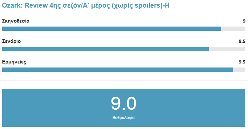 Η αρχή της 4ης σεζόν, λοιπόν, του Ozark προσφέρει μπόλικες στιγμές ποιοτικής τηλεόρασης, κρατώντας φυσικά αρκετές απαντήσεις σε κρίσιμες ερωτήσεις για το δεύτερο μέρος.