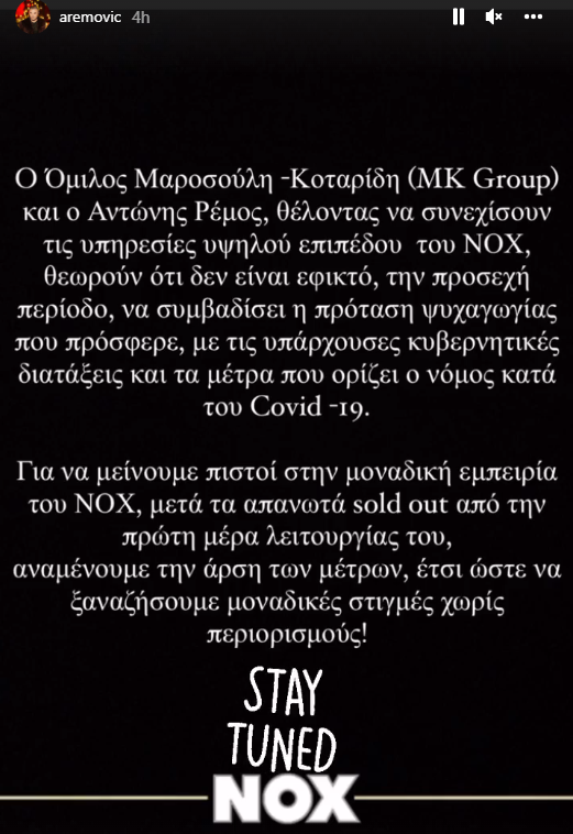Συγεκκριμένα με ανάρτησή του στο instagram ο Αντώνης Ρέμος αναφέρει: «O Όμιλος Μαροσούλη-Κοταρίδη (MK Group) και ο Άντωνης Ρέμος, θέλοντας να συνεχίσουν τις υπηρεσίες υψηλού επιπέδου του NOX, θεωρούν ότι δεν είναι εφικτό, την προσεχή περίοδο, να συμβαδίσει η πρόταση ψυχαγωγίας που πρόσφερε, με τις υπάρχουν κυβερνητικές διατάξεις και τα μέτρα που ορίζει ο νόμος κατά του Covid-19.
