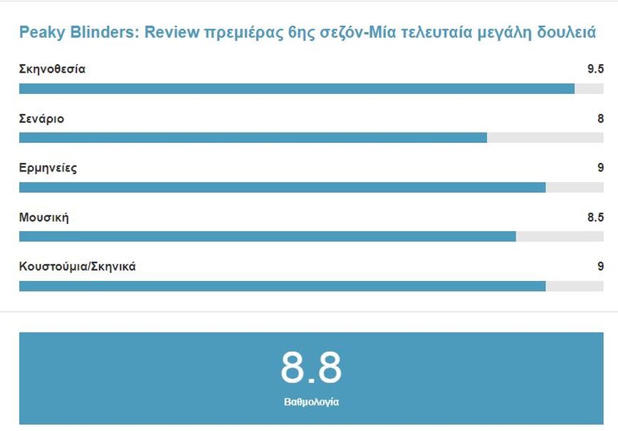 Μία πρεμιέρα που μας προϊδεάζει για το τι θα δούμε στη συνέχεια. Ένα τρομερό επεισόδιο από κάθε άποψη: εξαιρετική σκηνοθεσία με απολαυστικά πλάνα και μοναδική κινηματογράφηση, ερμηνείες που απλά δεν χάνονται με κορυφαία φυσικά του Cillian Murphy και μουσική που απλά θέτει τον τόνο στη σειρά. Σίγουρα το σενάριο δεν έχει κάποια τρομερή έκπληξη ή κάποιο σοκ (πλην του θανάτου της Polly, τον οποίο περιμέναμε) αλλά σίγουρα αυτά θα ακολουθήσουν!