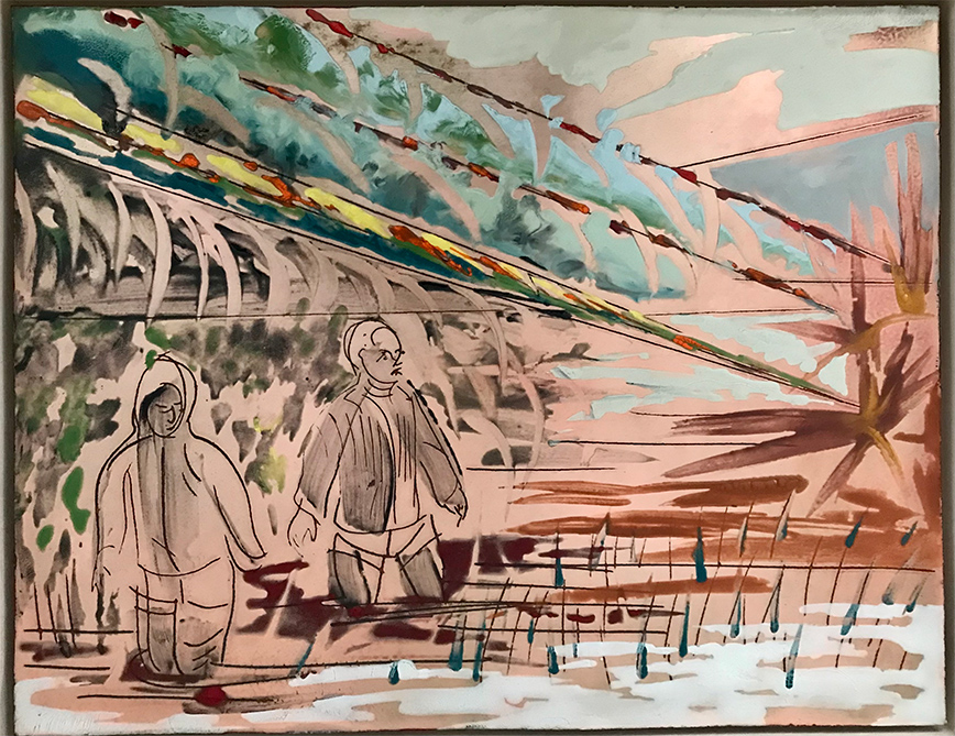 Η έκθεση που παρουσιάζεται στον Χώρο Τέχνης της Εθνικής Ασφαλιστικής, «ΣΤΟart Κοραή», αποτελείται από δύο ξεχωριστές ενότητες. Στην πρώτη έχουμε την κλασική ζωγραφική με πέντε δυναμικά ζωγραφικά τοπία και ισάριθμα σχέδια, στα οποία ο καλλιτέχνης πραγματεύεται ζητήματα όγκων και σύνθεσης. Η δεύτερη και μεγαλύτερη ενότητα αποτελείται από τα σμάλτα. «Εδώ ο κόσμος του φανταστικού συνομιλεί με το πραγματικό. Η ηρεμία εναλλάσσεται με την ένταση. Στον κόσμο που ξετυλίγεται στη σειρά αυτή, τα παιδιά πετάνε, οι άνθρωποι παλεύουν, τα ζευγάρια ερωτεύονται. Στο σύνολο των έργων επικρατεί η αίσθηση της χαράς και της αισιοδοξίας», θα σημειώσει η κυρία Παστάκα.