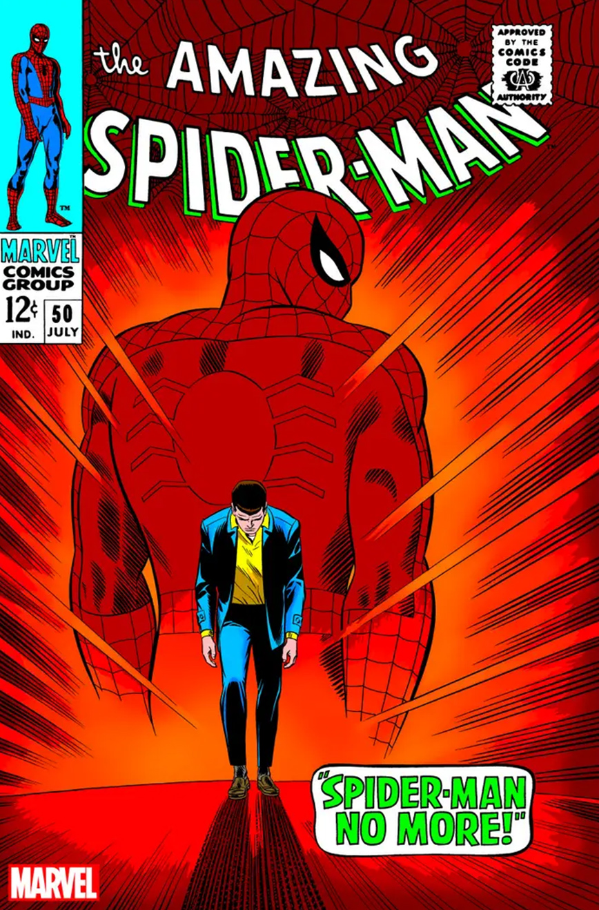 Ο Πίτερ Πάρκερ βαρέθηκε να μην τον σέβονται για όλες τις ζωές που έσωσε και παραιτήθηκε από το να είναι ο Spider-Man με αφορμή το 50ό τεύχος του. Το θέαμα του να γυρίζει την πλάτη του στην προσωπικότητα του υπερήρωα σε αυτό το εξώφυλλο είναι μια ζοφερή προεπισκόπηση της σύντομης αλλά σοβαρής κρίσης ταυτότητάς του.