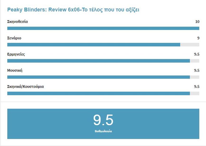 Από τη συγκινητική μουσική, την ασυναγώνιστη κινηματογράφηση, τις απίστευτες ερμηνείες, μέχρι το καλοχτισμένο σενάριο, το επεισόδιο πετυχαίνει να δώσει ένα τέλος που αρμόζει στο Peaky Blinders. Για περισσότερα σχετικά με την 6η σεζόν, θα τα πούμε στο αντίστοιχο review.