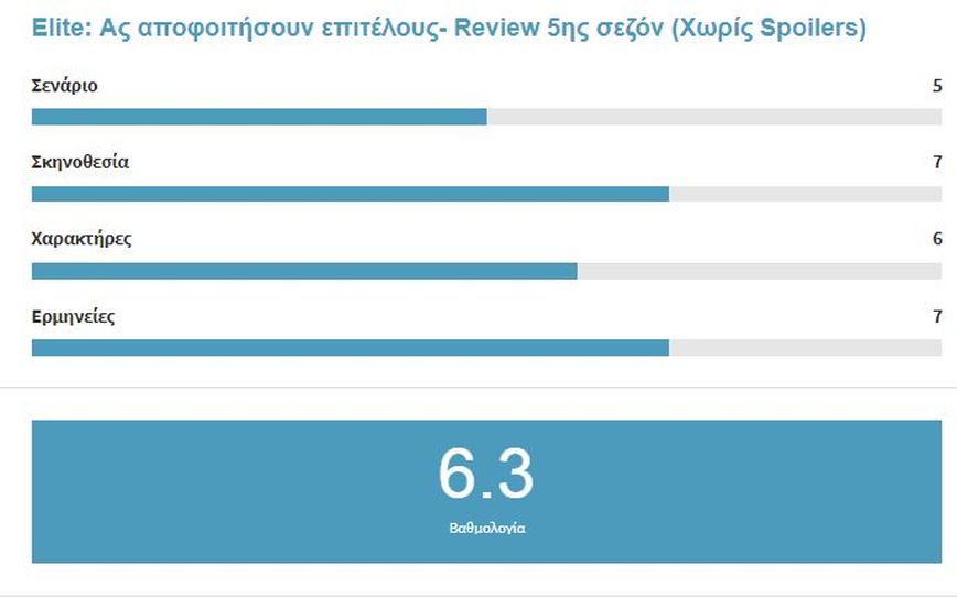 Τα 8 επεισόδια της νέας σεζόν φεύγουν αρκετά εύκολα, το πρόβλημα με το Elite δεν ήταν ποτέ η ροή του, αντιθέτως αν το δεις στο χαλαρό παραμένει αρκετά απολαυστικό. Αν προσπαθήσεις να το συγκρίνεις με τις πρώτες σεζόν τότε εκεί χάνεται η μπάλα. Πλέον είναι μια αρκετά καλή ενοχή απόλαυση η οποία μάλιστα έχει ανανεωθεί και για 6η σεζόν. Ο μόνος τρόπος να σταματήσουμε να το βλέπουμε είναι να αποφοιτήσουν όλοι οι μαθητές!
