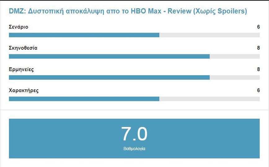 Το HBO Max σχεδόν ποτέ δεν μας απογοητεύει και στην περίπτωση του DMZ τα πράγματα δεν είναι κακά απλά θα μπορούσαν εύκολα να είναι πολύ πολύ καλύτερα. Αν η ταλαντούχα Rosario Dawson, τα καλοφτιαγμένα εφέ του HBO Max και τα μόλις 4 επεισόδια της ιστορίας δεν σας ψήνουν για να το δείτε τσεκαρετε το Trailer εμένα σίγουρα με είχε κερδίσει! Η σειρά φαινομενικά είναι ολοκληρωμένη οι δημιουργοί της βέβαια έκαναν νύξεις για περισσότερες ιστορίες στον κόσμο του DMZ κάτι που δεν θα με χαλαγε καθόλου μιας που βασικό μου παράπονο είναι η έλλειψη πληροφοριών που παρέχει η σειρά σε κάποια θέματα.
