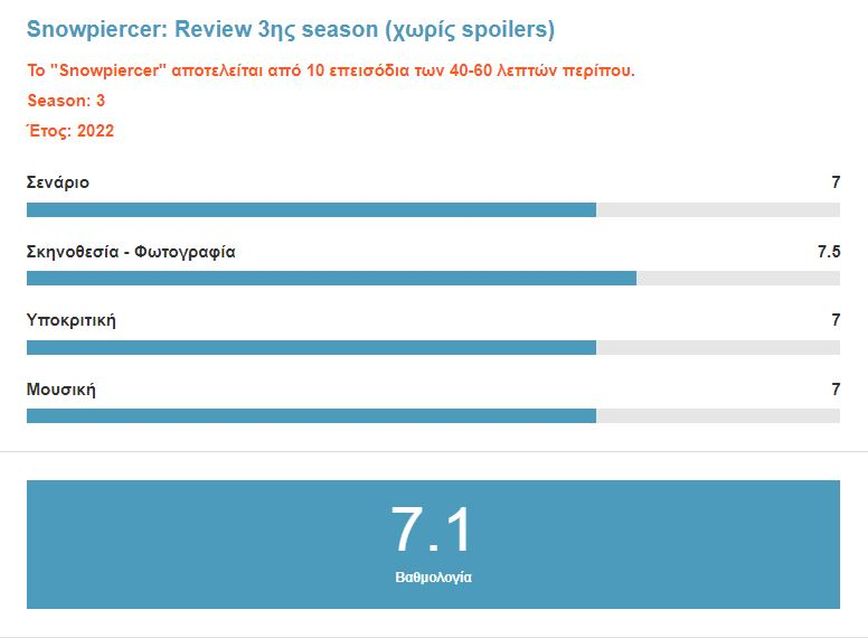 Κλείνοντας έχω να πω πως το Snowpiercer είναι μία ένοχη απόλαυση καθώς δεν είναι η σειρά που θα σε συναρπάσει, αλλά είναι η σειρά που θα θες να βλέπεις. Υπάρχει επίσημη ανακοίνωση πως η σειρά ανανεώθηκε και για 4η season χωρίς όμως παραπάνω πληροφορίες, αλλά και πως θα υπάρχει και αλλαγή showrunner όπου είμαι περίεργος τι αλλαγές θα φέρει. Σίγουρα όπως τελείωσε η 3η season πάντως αν θελήσουν έχουν πολλά ωραία πράγματα να μας μεταφέρουν.
