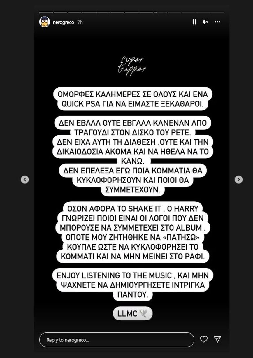 Όσον αφορά το Shake it, ο Harry γνωρίζει ποιοι είναι οι λόγοι που δεν μπορούσε να συμμετέχει στο άλμπουμ, οπότε μου ζητήθηκε να να «πατήσω» κουπλέ, ώστε να κυκλοφορήσει το κομμάτι και να μην μείνει στο ράφι. Απολαύστε τη μουσική και μην ψάχνετε να δημιουργήσετε ίντριγκα παντού. LLMC».